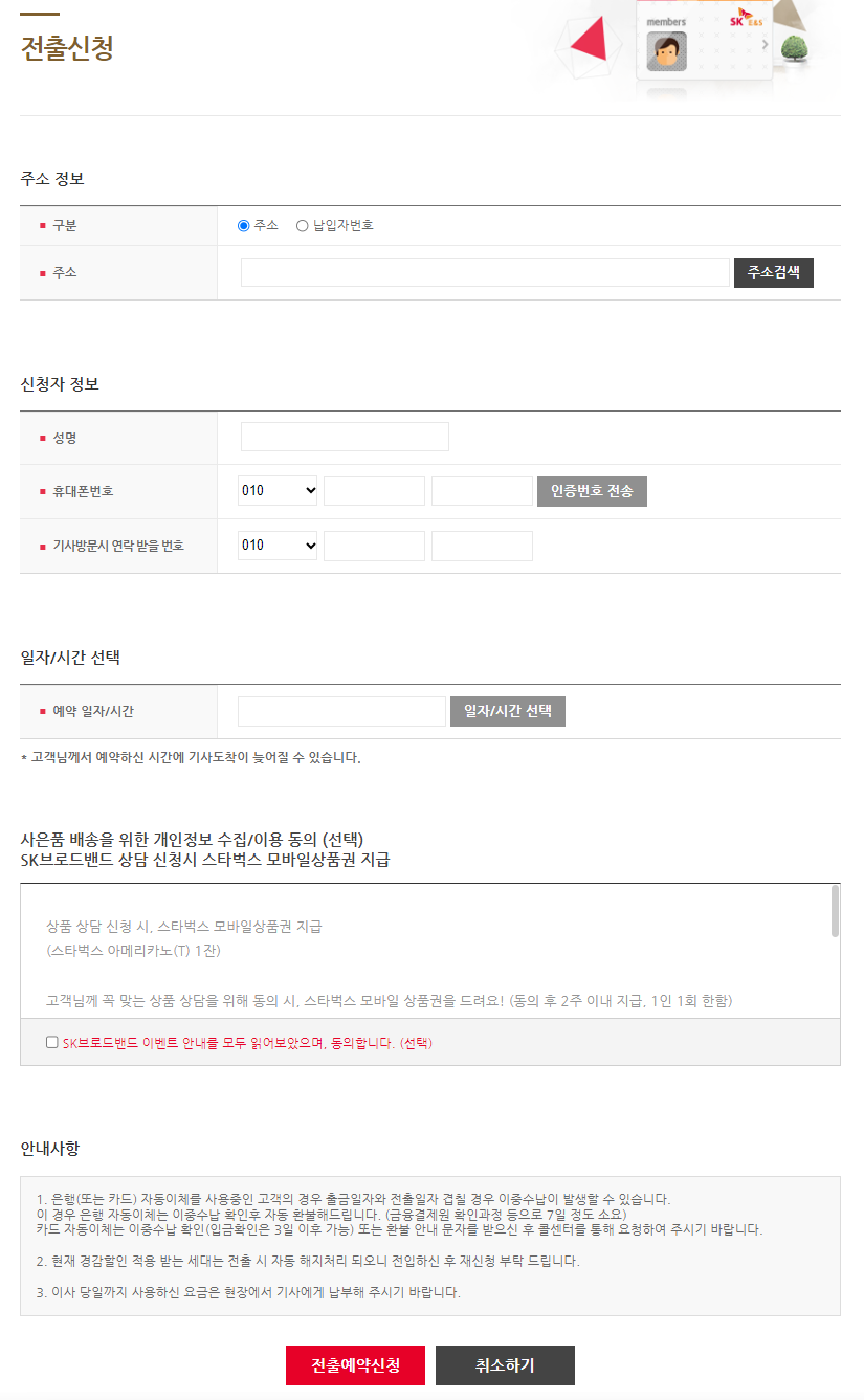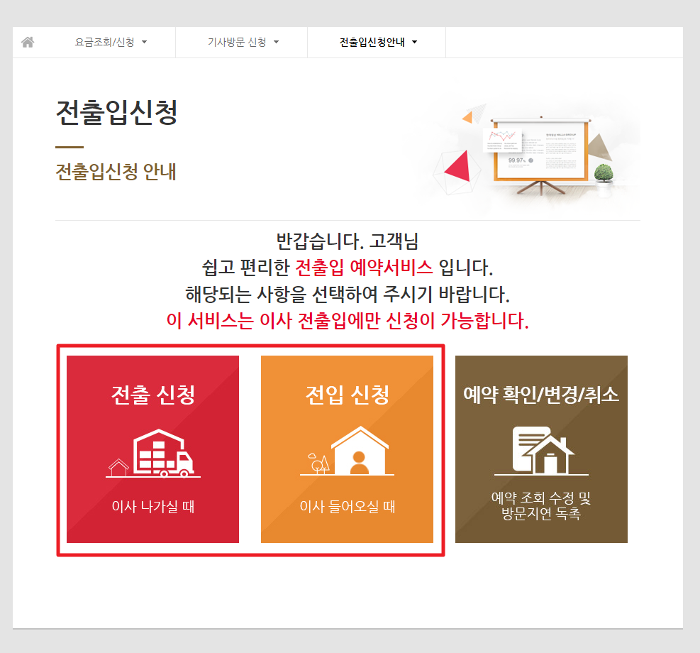 홈페이지 전출입신청에서 주소, 납입자번호 입력, 신청자 정보, 예약일자 등 입력해야 할 사항을 입력하면 전출, 전입 예약 신청이 간편하게 가능합니다.