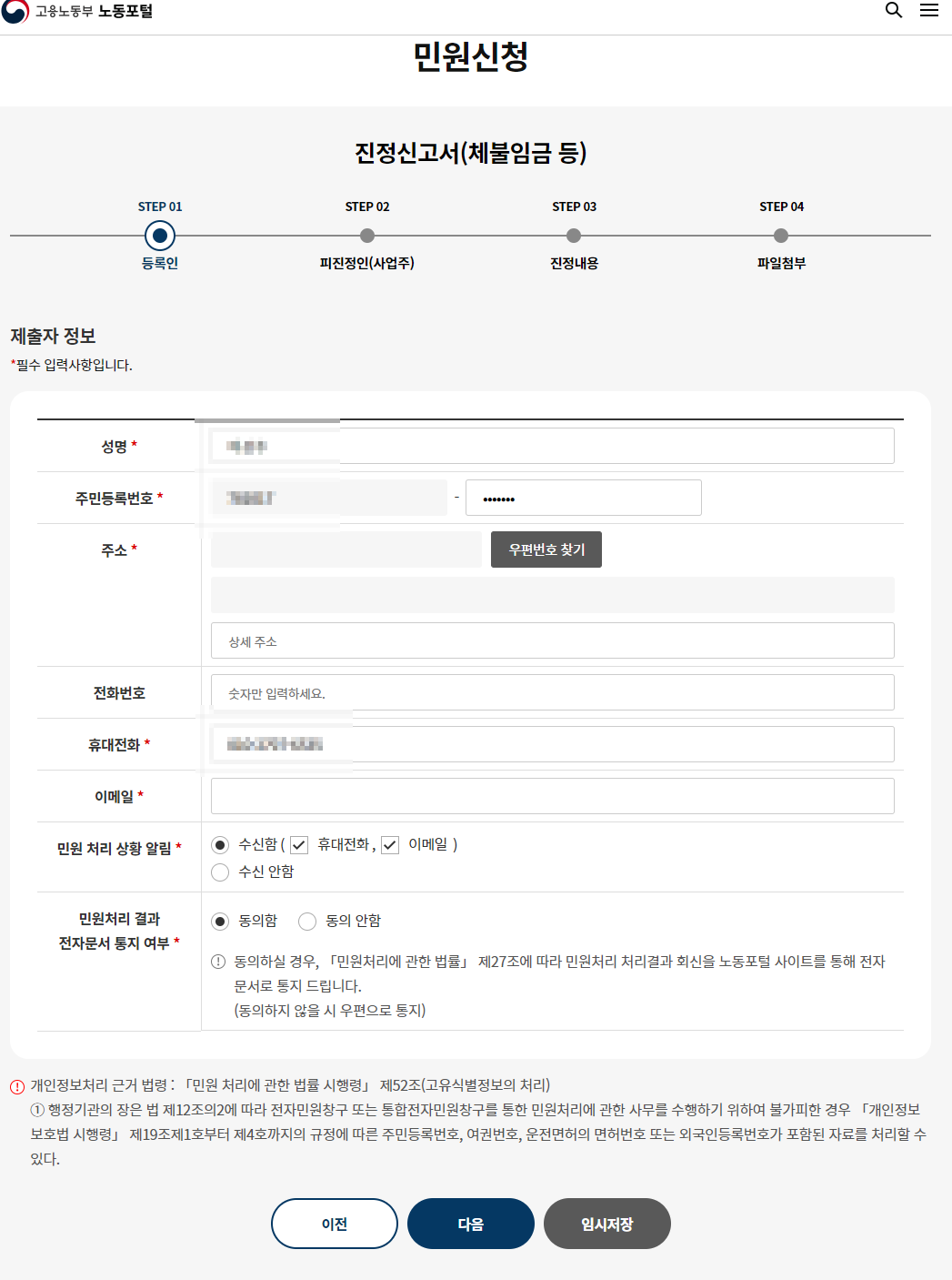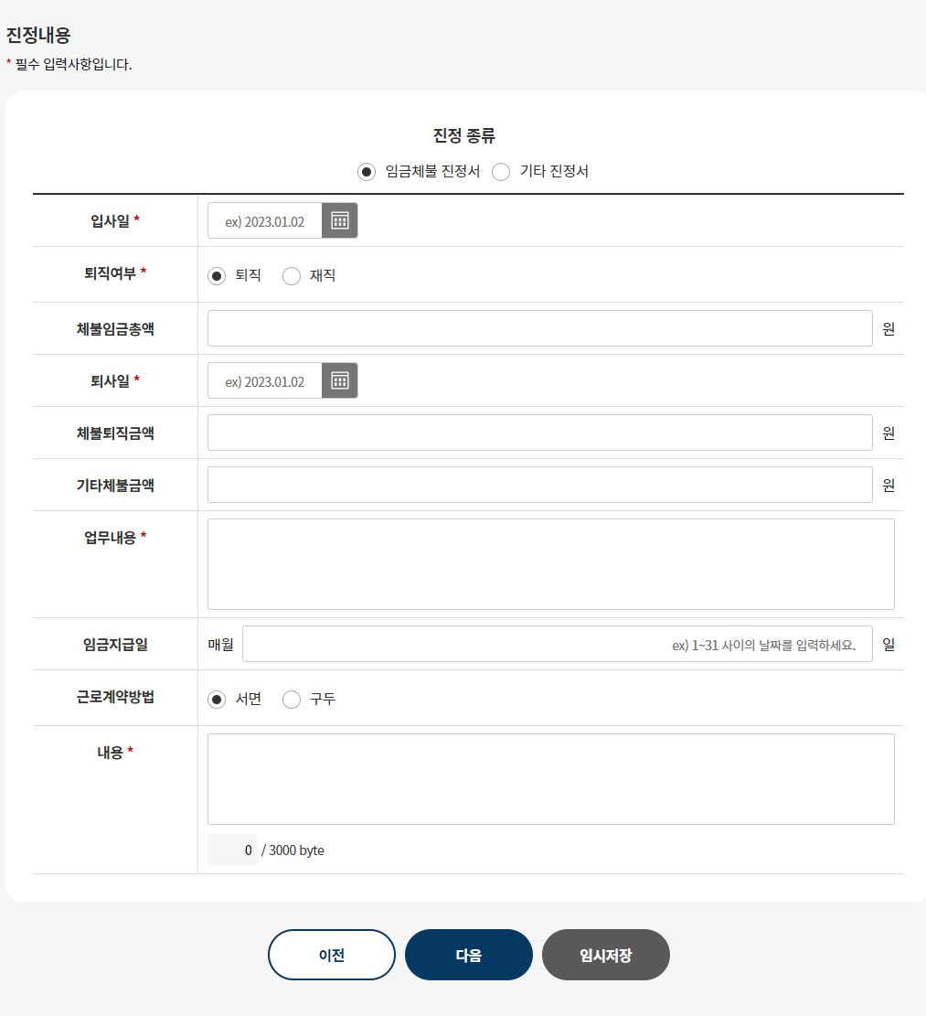 👉 임금체불진정서는 급여미지급 등 노동관계법 위반사항에 대하여 신고하실 수 있는 절차입니다.