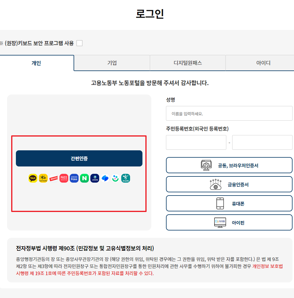 2. 로그인 화면이 나오면 성명 등 필요사항을 입력하고 간편 인증을 진행합니다.