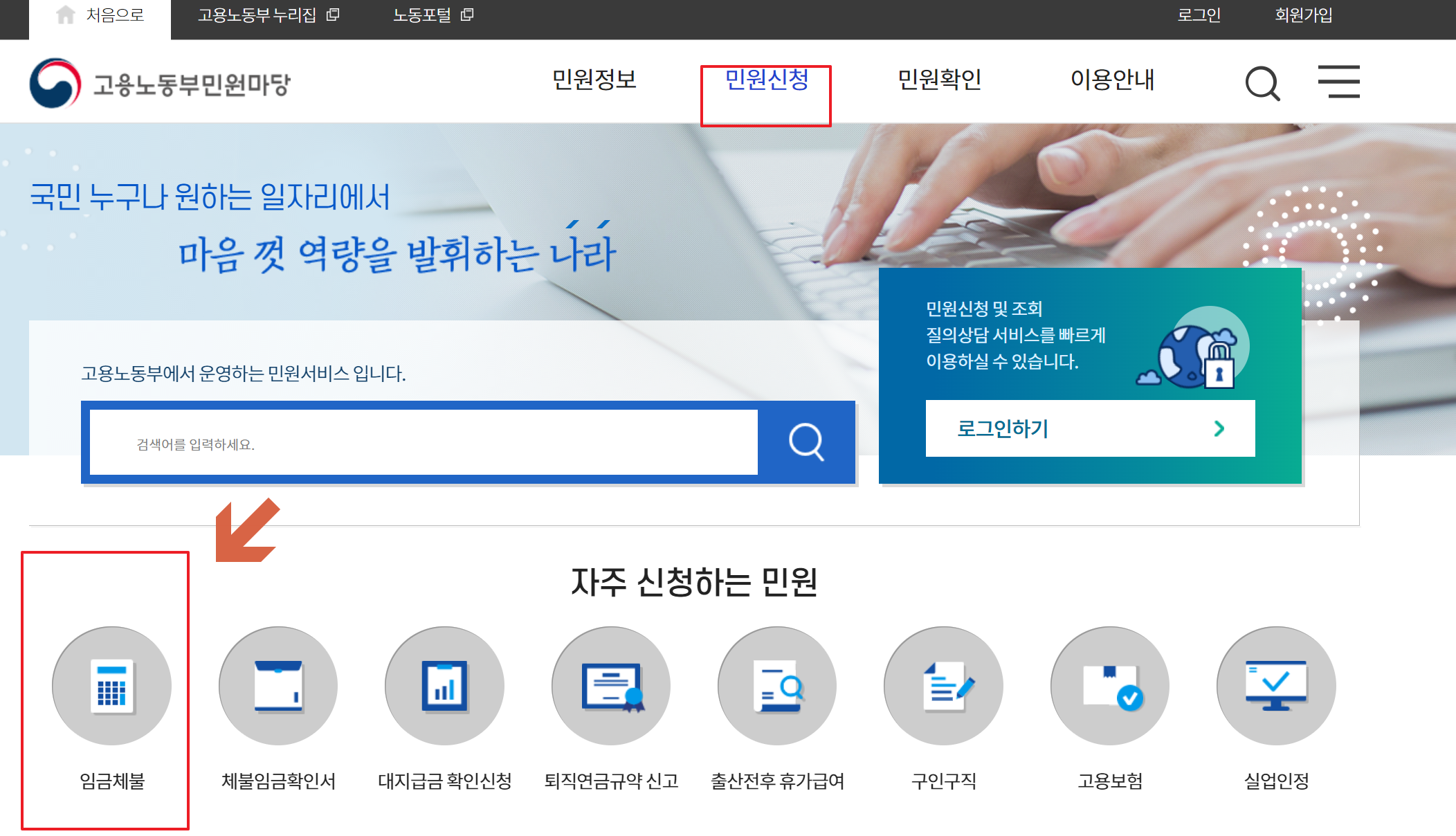 1. 고용노동부 민원마당에 접속하여 > 민원신청 > 임금체불을 선택합니다.