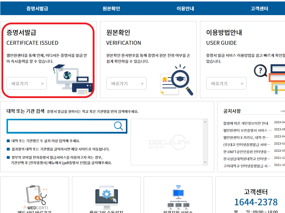 👉 1. 아래 사이트를 접속하신 후 [증명서 발급]을 클릭합니다.