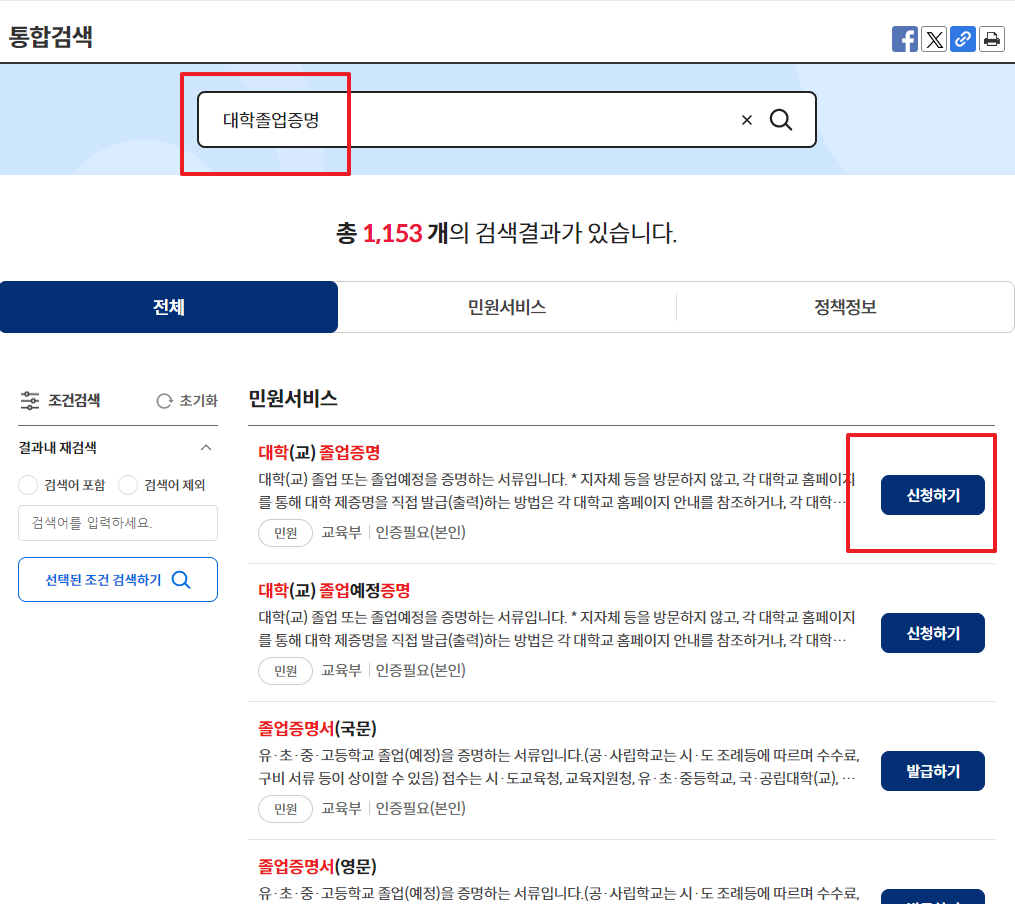 1. 정부 24 홈페이지에 접속하여 '대학교 졸업증명’을 검색하고, 신청하기를 클릭합니다.