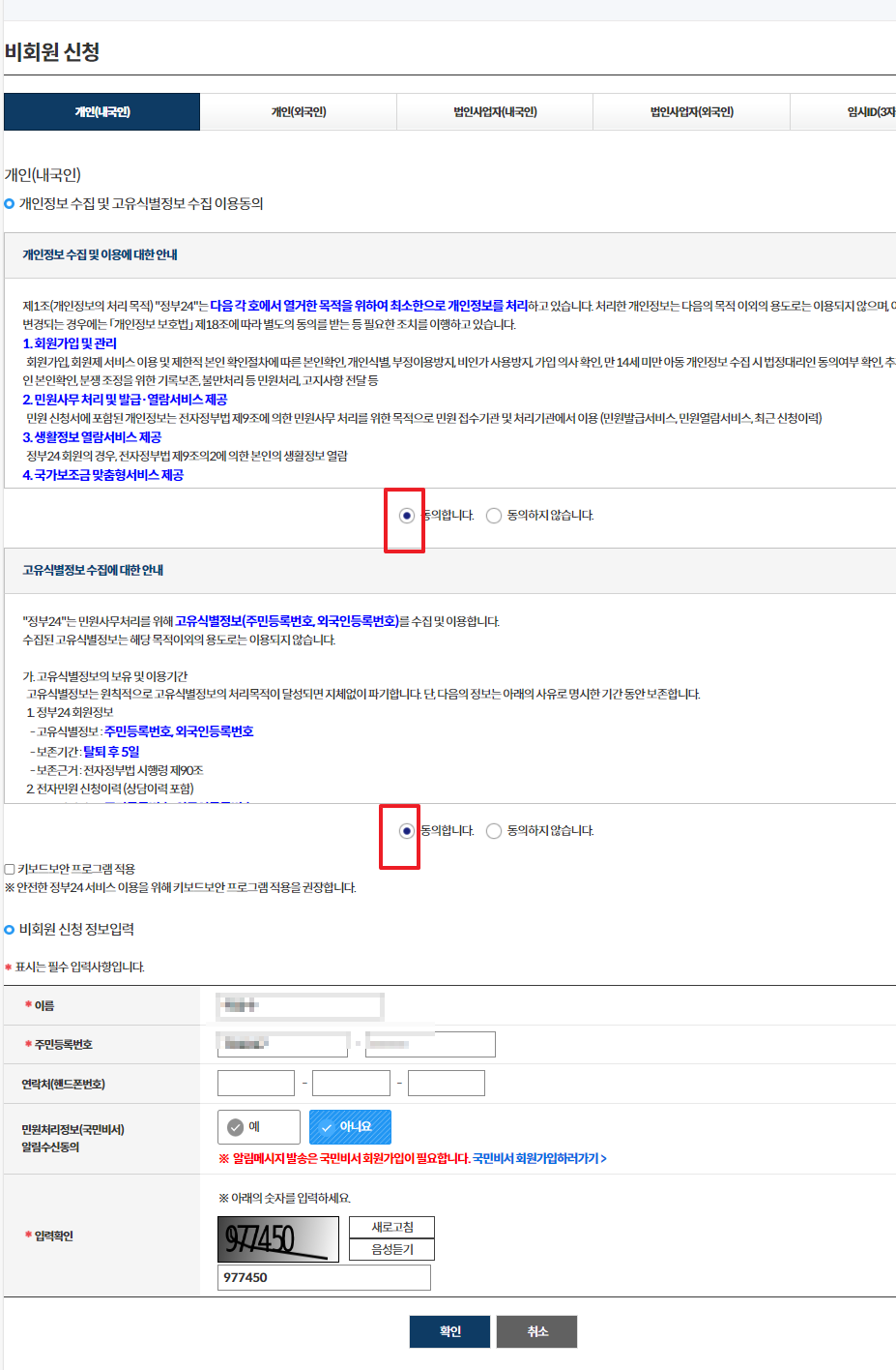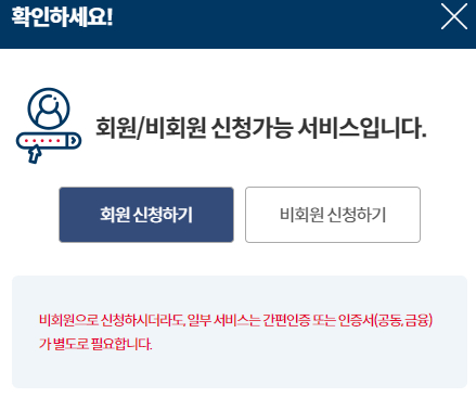 2. 간편 인증 또는 인증서를 통한 로그인을 하십니다. (비회원 신청하기도 가능합니다.)