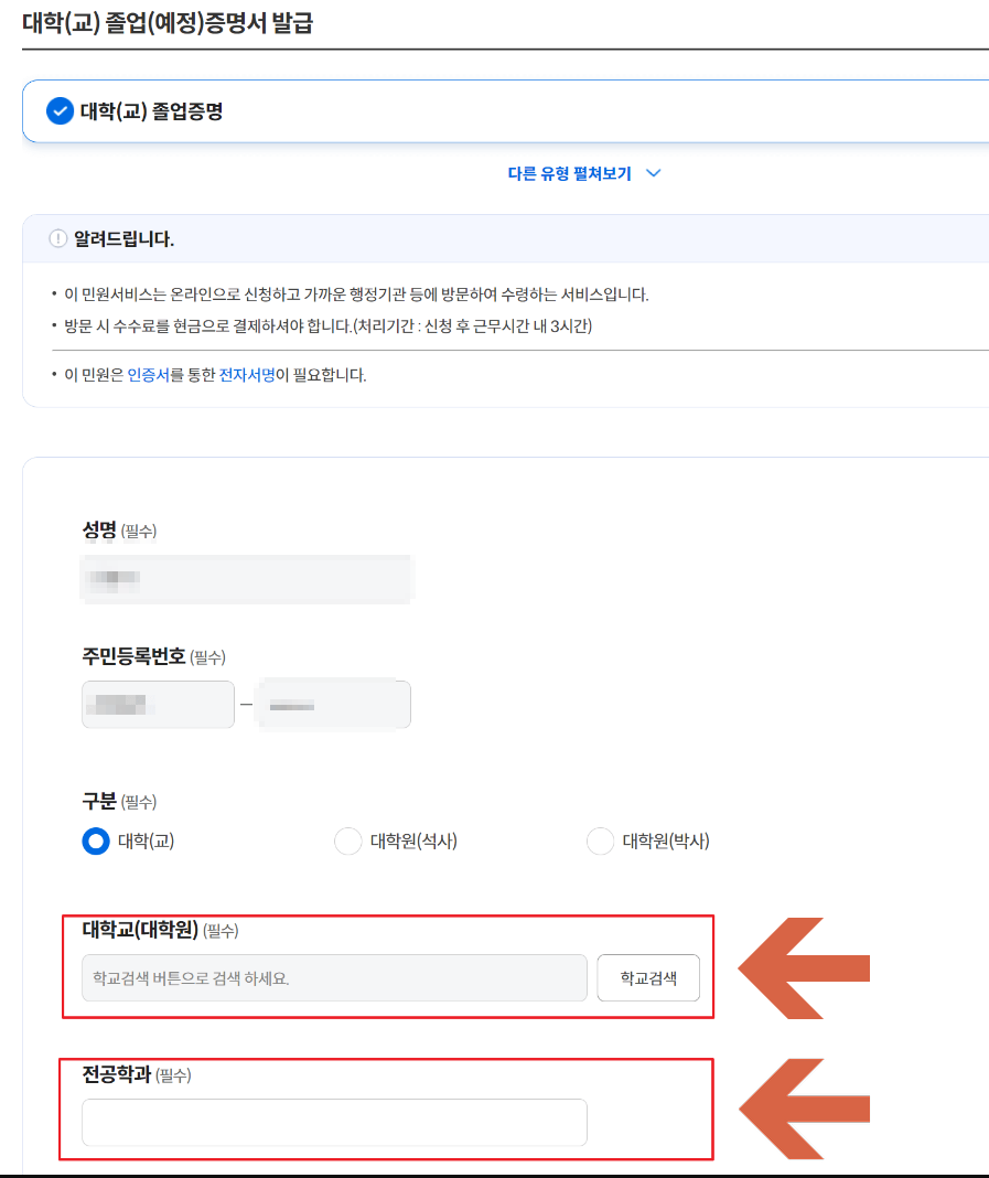 2. 본인이 졸업한 대학교를 검색하고, 전공학과를 입력합니다.