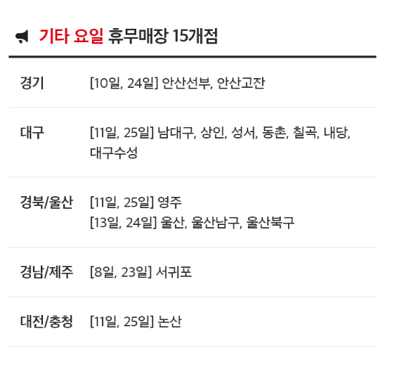 하지만, 대두분 매장이 매월 동일한 일요일에 휴무를 하기 때문에 2월 및 3월 휴무 점포에 대해 알려드릴 테니, 참고하시면 됩니다.